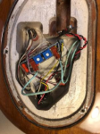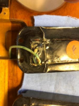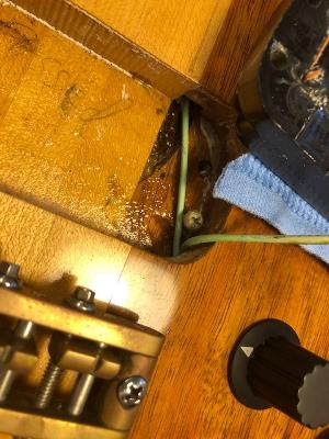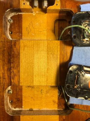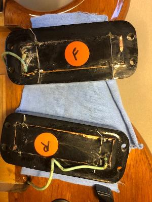 When I removed the pickups both of them looked odd to me. the copper shielding is visible as are the little hanger wires used in the potting process. Also the pickup wires in both pickups were "glued" to the floor of the cavity in a few places by some clear coating on the cavity floor. Not sure if this is original or something that leaked out of the pickups.